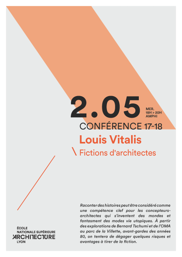 Louis Vitalis, « Fictions d’architectes », conférence à l’ENSA de Lyon, le 2 mai 2018, dans le cadre du cycle de conférence du domaine d’étude ALT : Architecture alternative, stratégies et pratiques émergentes.