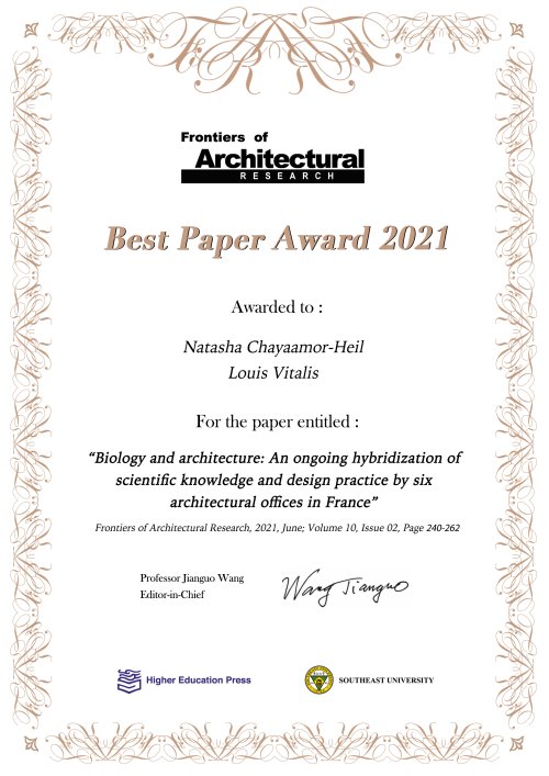 Dans l’objectif de promouvoir l’innovation dans le champ de la recherche en architecture le journal "Frontiers of Architectural Research" a sélectionné comme un des 6 meilleurs articles publiés en 2021 celui de Natasha Heil et Louis Vitalis intitulé "Biology and architecture : An ongoing hybridization of scientific knowledge and design practice by six architectural offices in France".